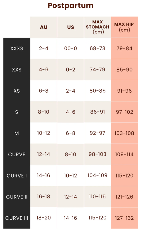 Postpartum bodies can change across the day due to swelling, fluid shifts and bloating. Try to measure at a time of day that feels typical for you, not immediately after a huge meal or a long, hot day on your feet. - Match your measurement to the postpartum size chart